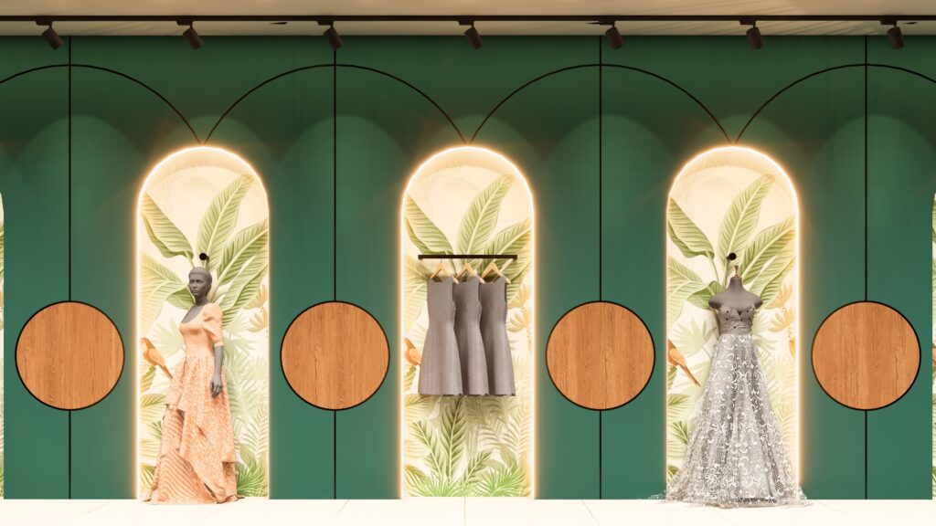 Sophisticated arch-shaped panels add a layer of refinement and timeless beauty to the space. These architectural elements draw the eye and contribute to the overall elegance of the boutique. Meanwhile, the tropical leaf wallpaper introduces a fresh, natural vibe, infusing the environment with a sense of vitality and connection to nature.