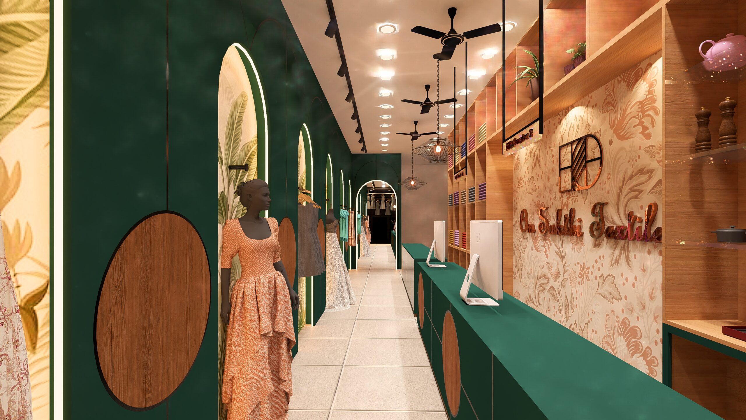 Soft, warm lighting is thoughtfully integrated throughout the design, illuminating the rich colors and intricate details of the space. This lighting choice enhances the luxurious feel of the boutique, creating an ambiance that invites exploration and appreciation of the surroundings.