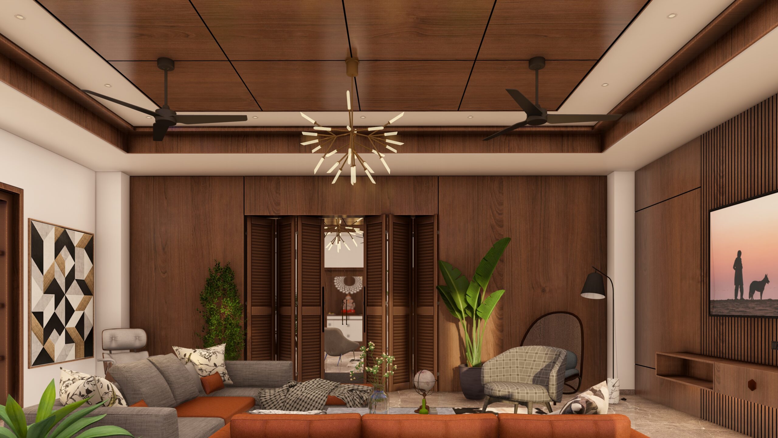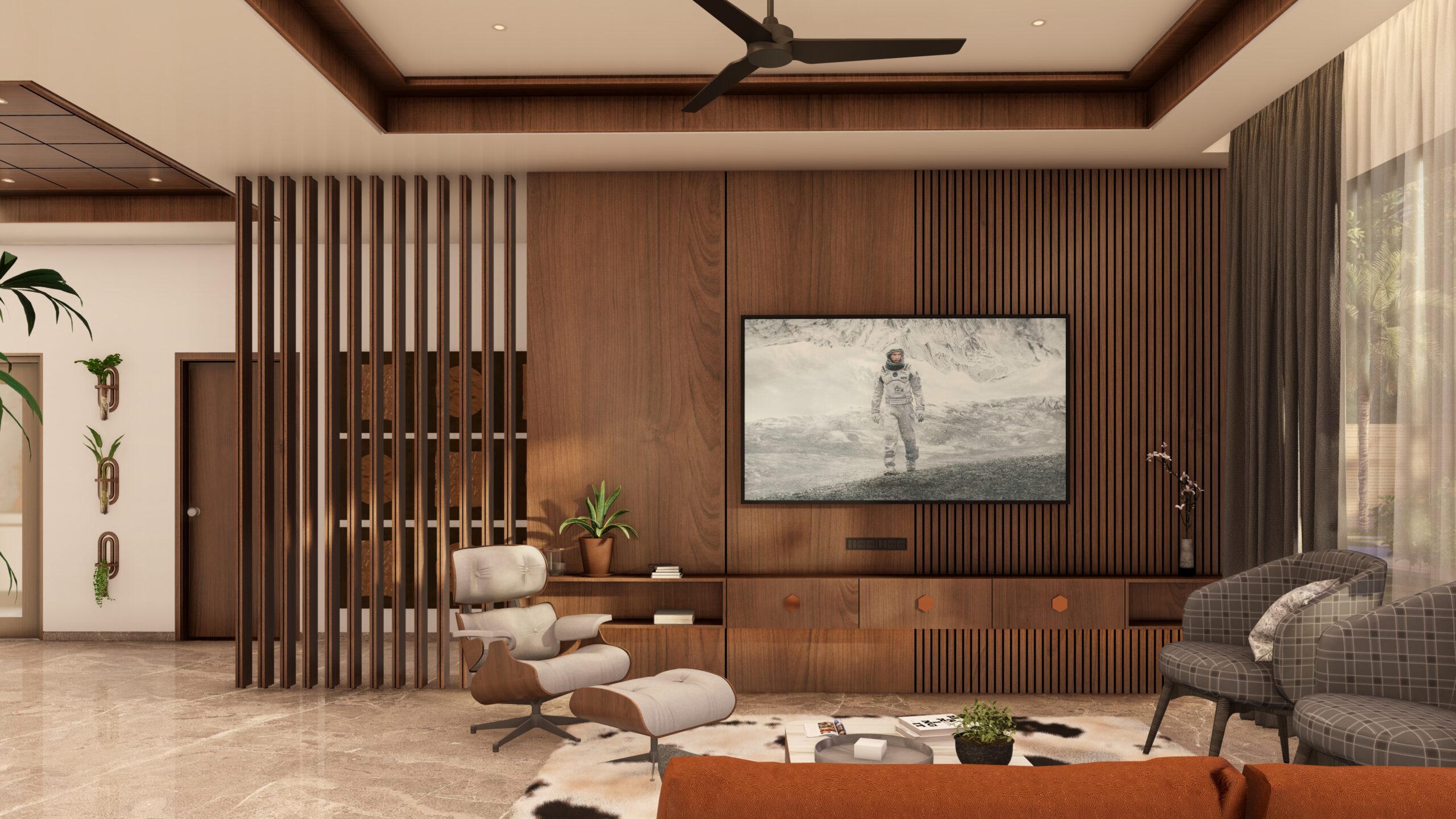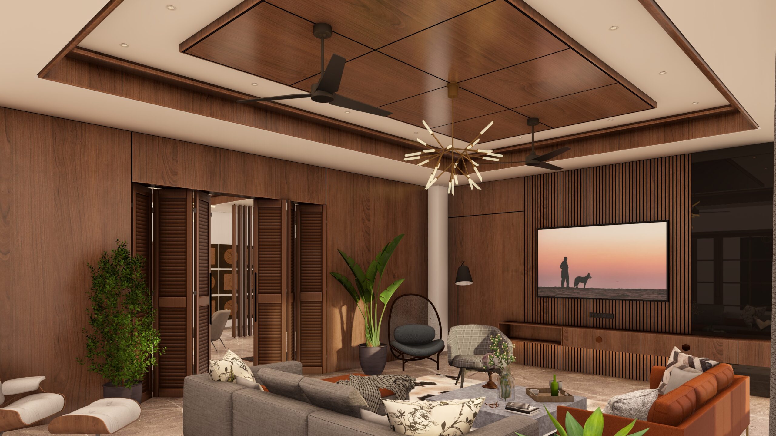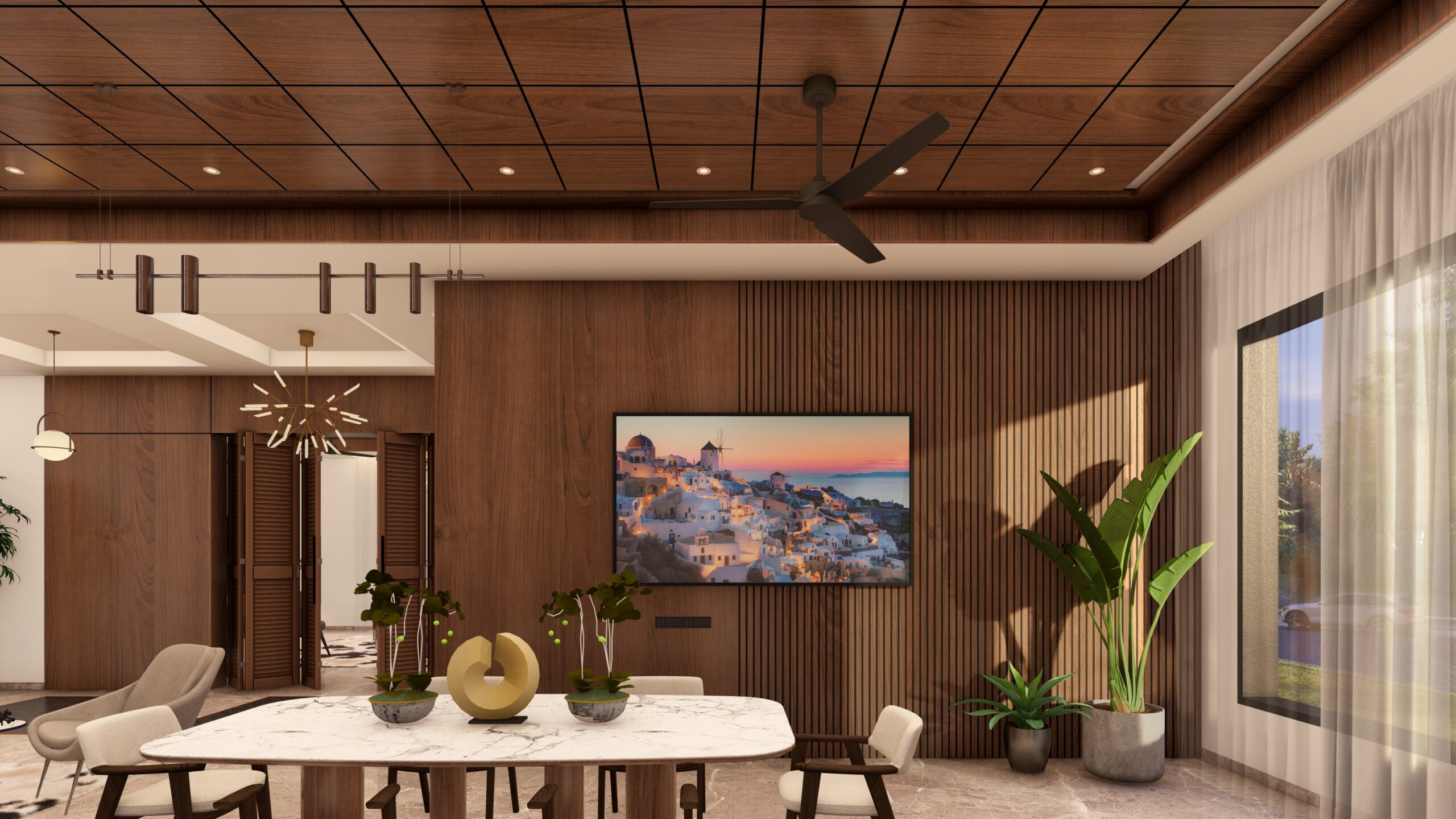 This ongoing interior project showcases a minimalist design that embraces a refined color palette centered around wood, exuding an air of understated luxury. The use of walnut-finished wooden veneers establishes a warm foundation, harmoniously paired with black-tinted glass and brass fittings that add a touch of elegance. This cohesive design theme flows seamlessly across the living, dining, and foyer areas, creating a unified and inviting atmosphere throughout the home.