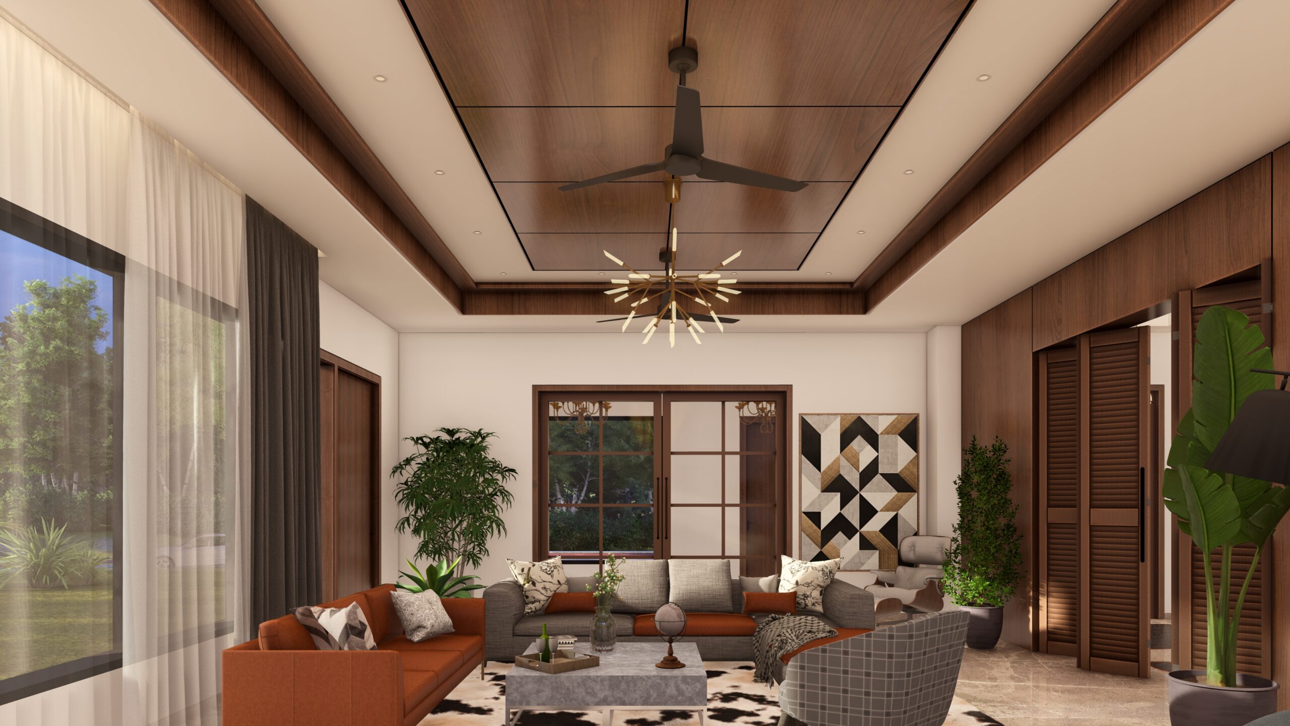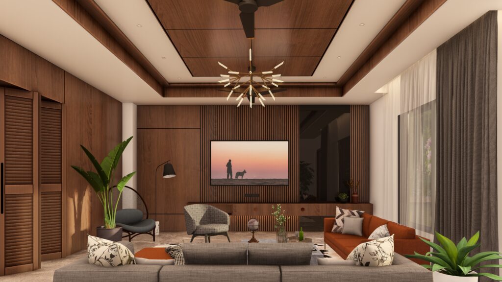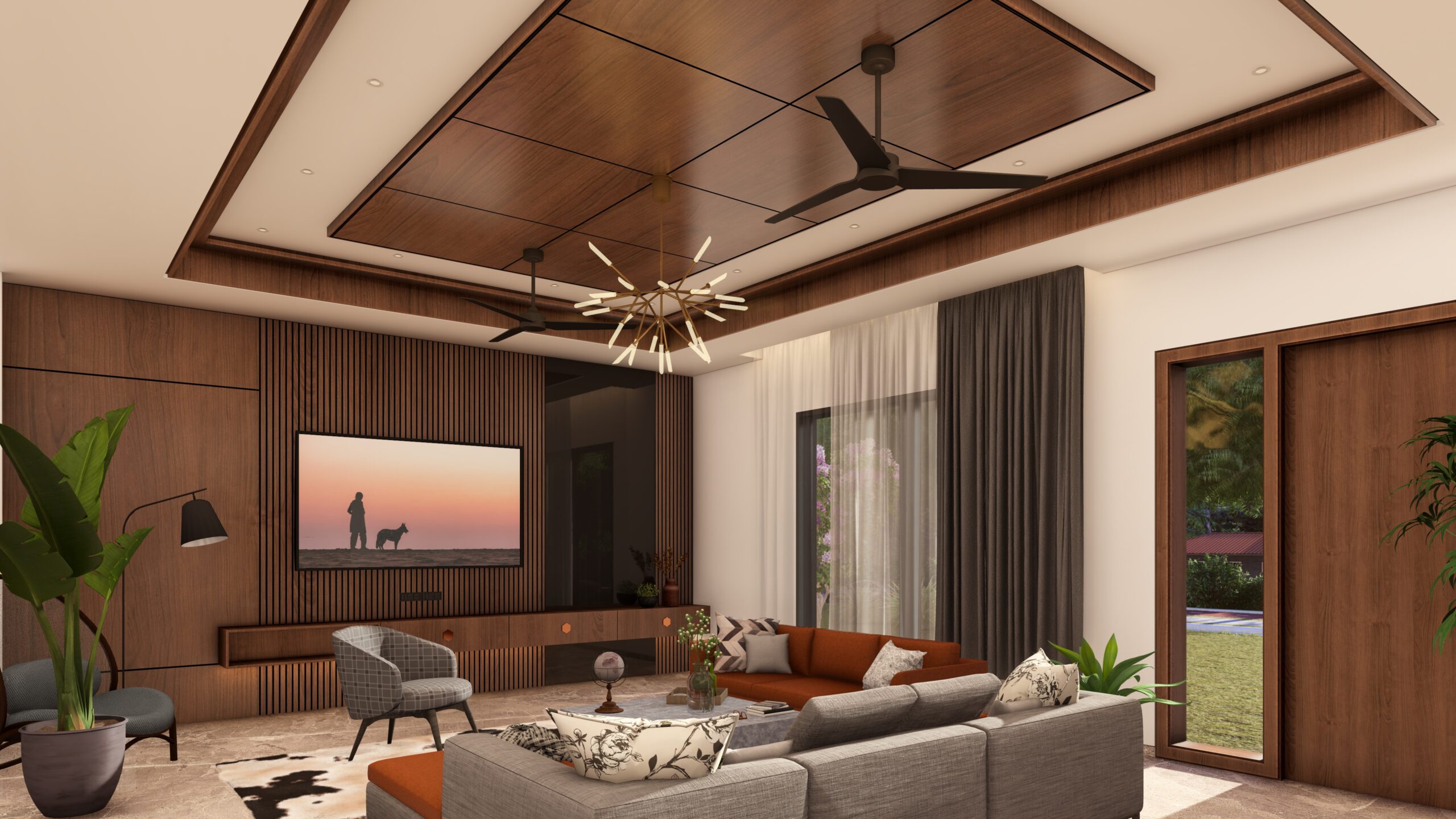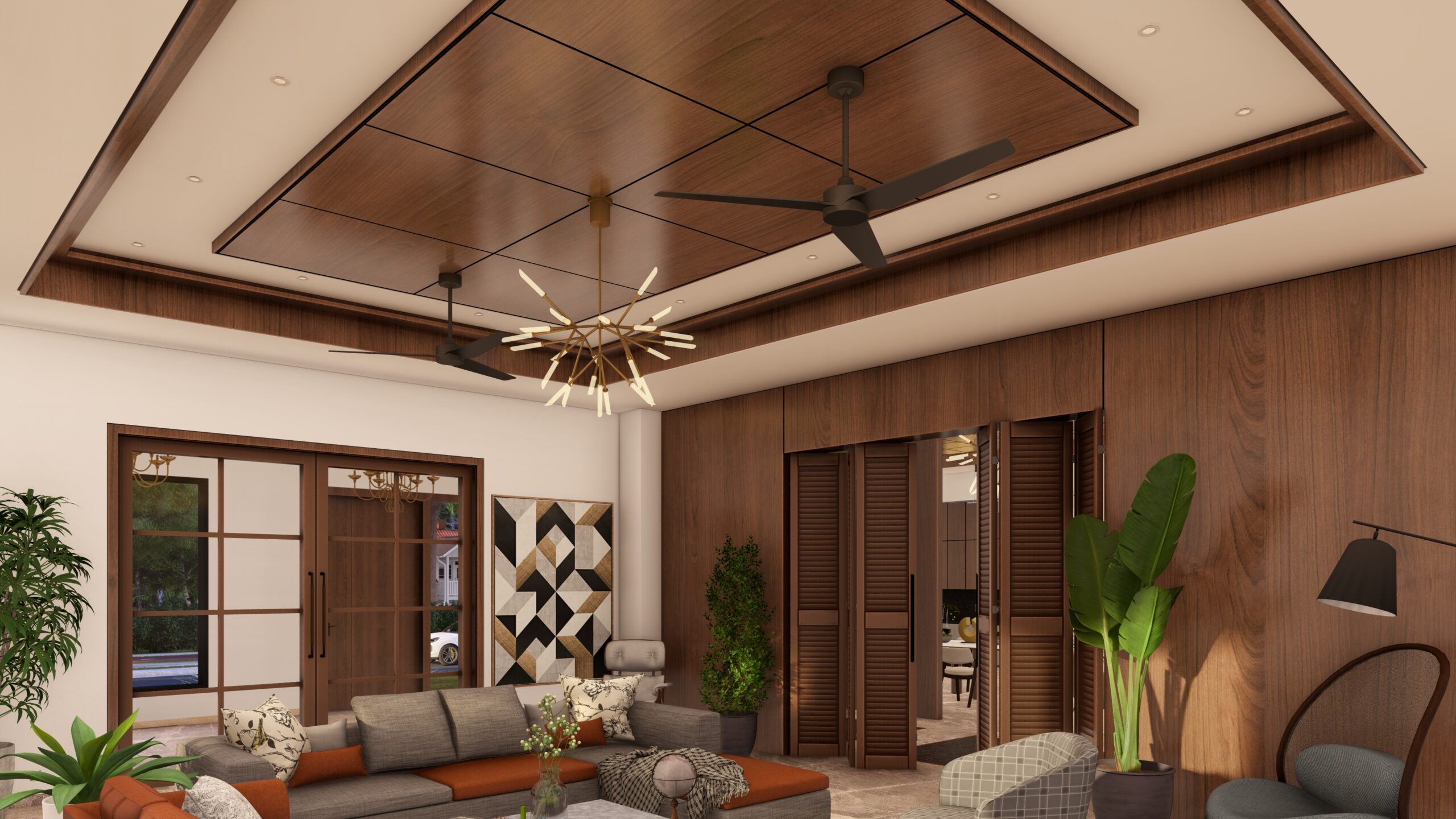 This ongoing interior project showcases a minimalist design that embraces a refined color palette centered around wood, exuding an air of understated luxury. The use of walnut-finished wooden veneers establishes a warm foundation, harmoniously paired with black-tinted glass and brass fittings that add a touch of elegance. This cohesive design theme flows seamlessly across the living, dining, and foyer areas, creating a unified and inviting atmosphere throughout the home.