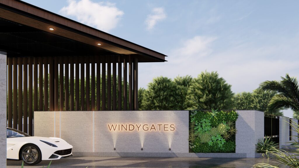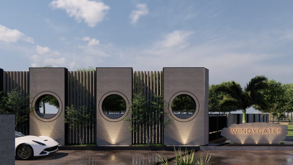 Overall, this entrance embodies a sense of exclusivity and luxury, making a refined first impression. It seamlessly integrates contemporary aesthetics with a connection to nature, creating a welcoming yet impressive threshold for the community.