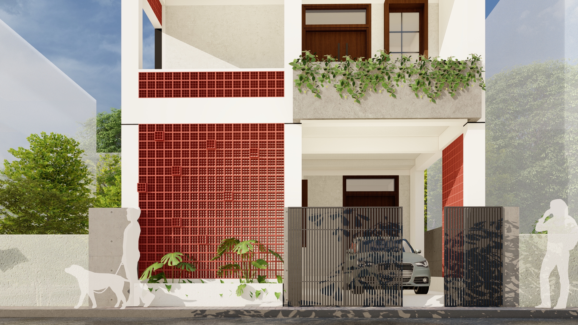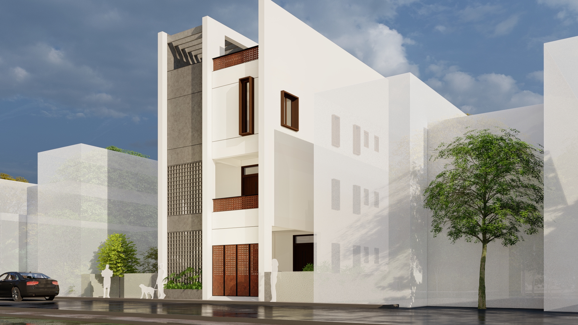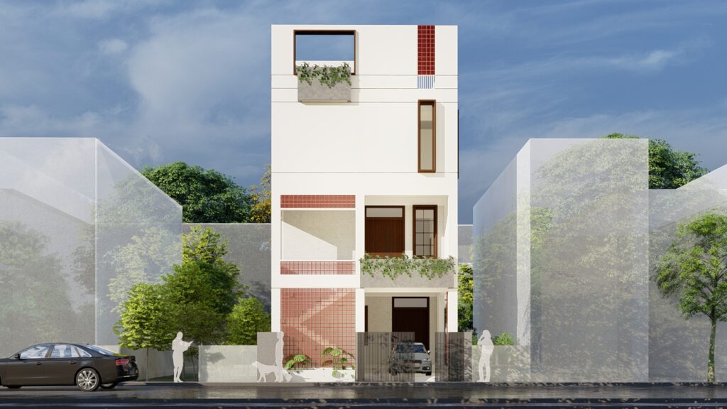 This architectural project, situated on a 30' x 50' plot, exemplifies a clean and minimalistic design that prioritizes balance and functionality. The standout feature of the façade is the use of terracotta Jali (lattice), which adds both texture and depth to the building while complementing its predominantly white exterior. This combination creates a striking contrast that feels modern yet deeply rooted in tradition.