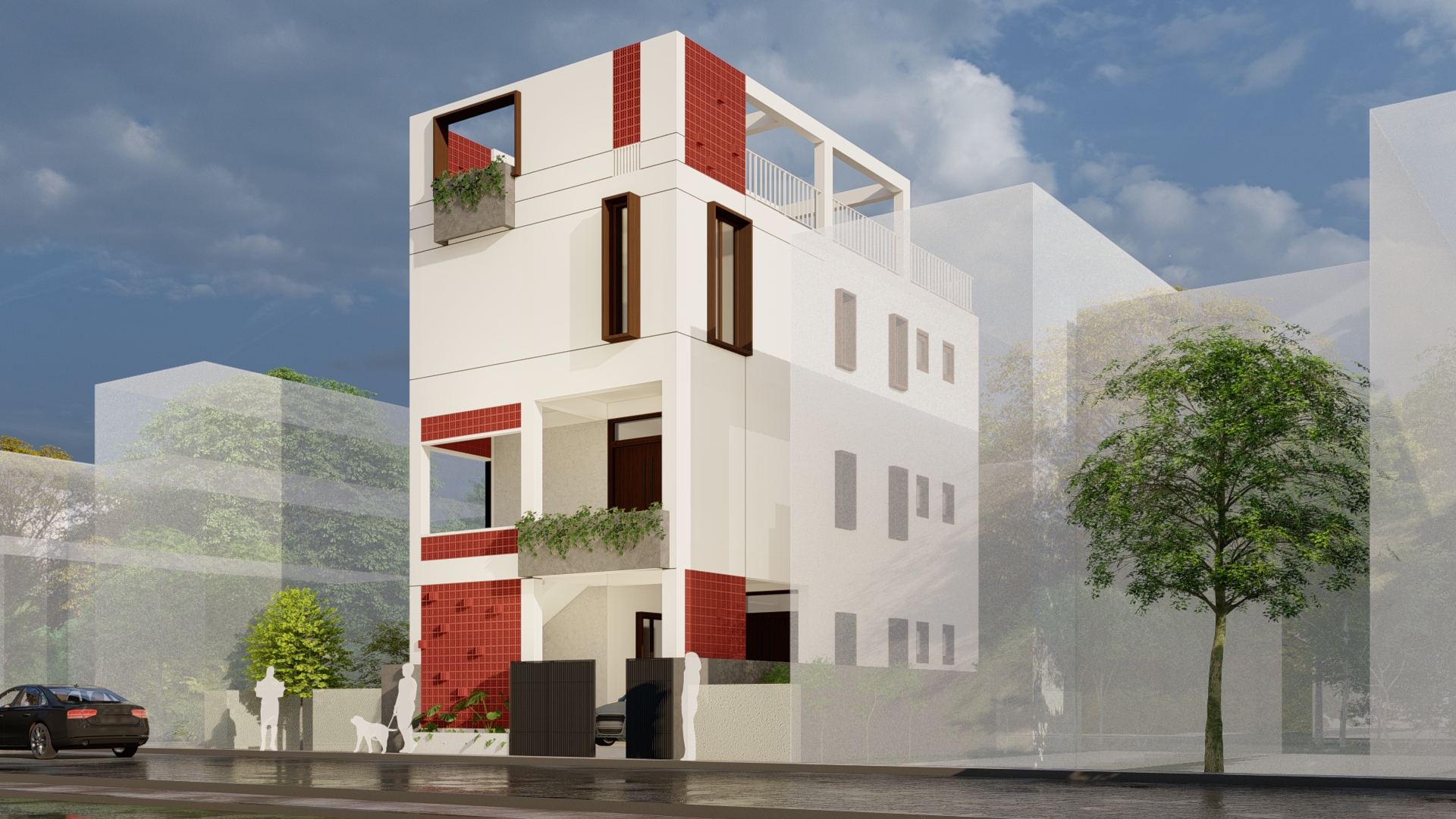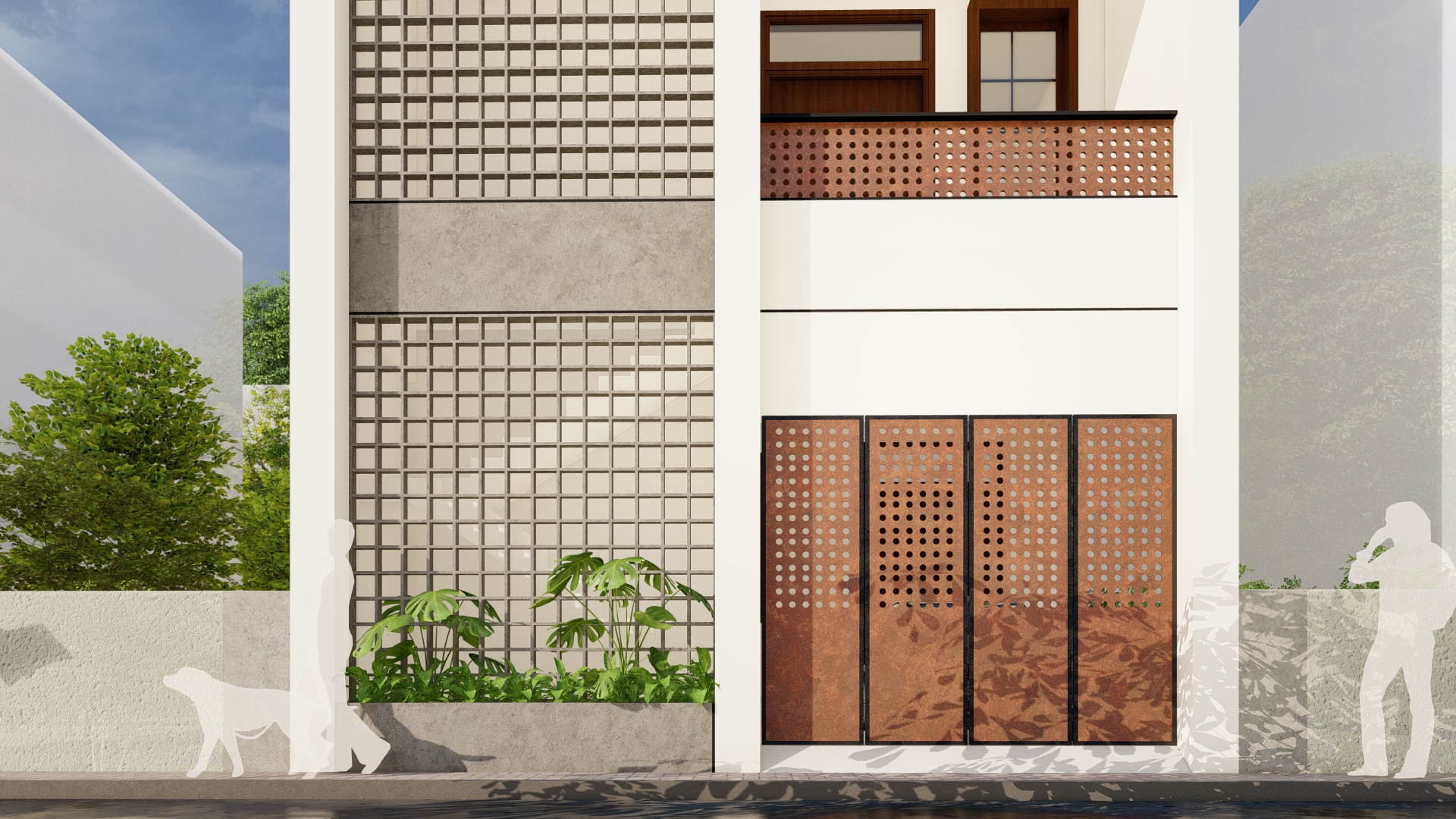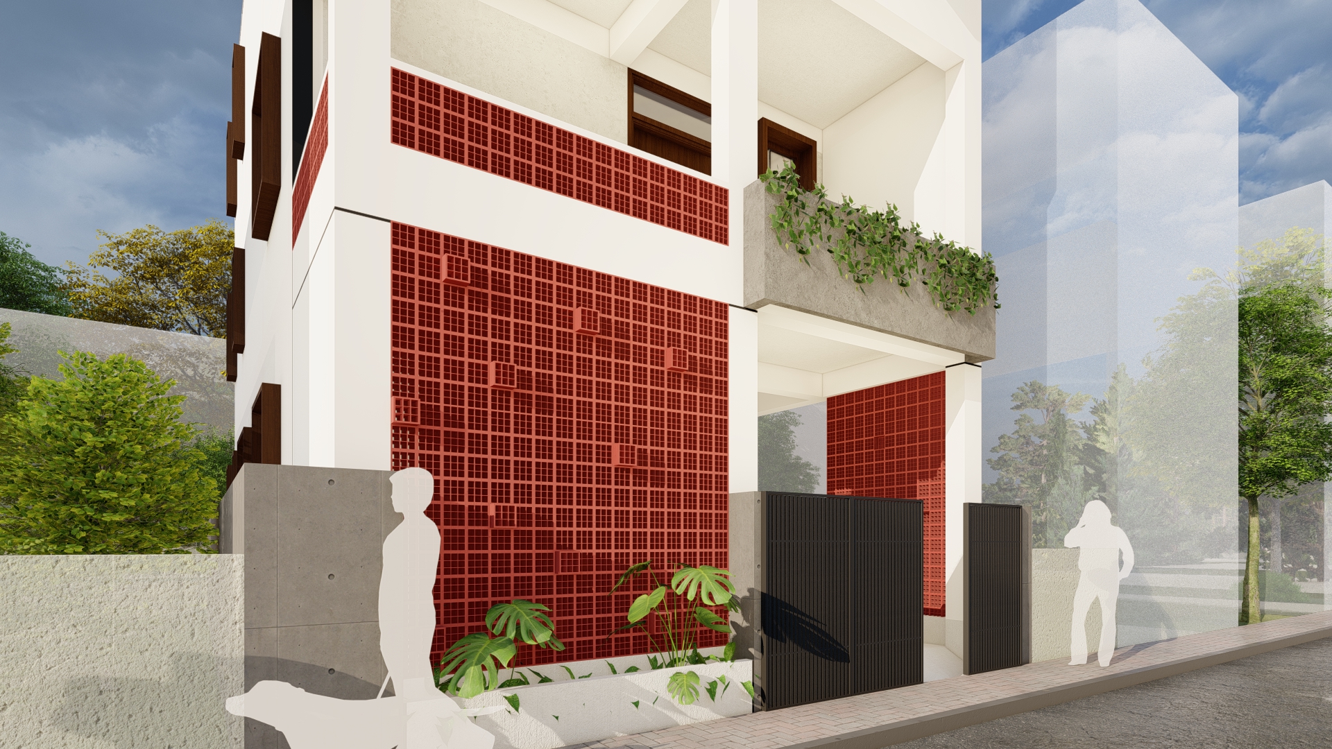 The terracotta jali serves dual purposes—enhancing the building's visual appeal while facilitating natural ventilation and light. This design choice ensures that the spaces behind the jali remain comfortable and energy-efficient, reducing reliance on artificial cooling and lighting. Additionally, planters on the balconies introduce greenery that softens the overall aesthetic, balancing the geometric forms of the jali with the sharpness of the white façade. These planter boxes contribute a refreshing natural element to the otherwise structured environment.